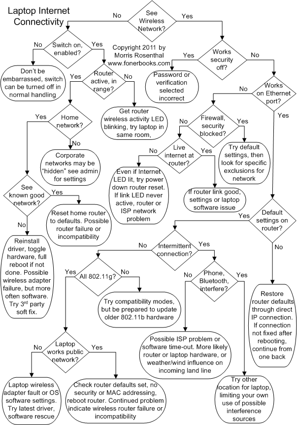 Troubleshooting Laptop Wireless ConnectionsNote that these steps correspond with decision points on the flowchart and are reached directly by clicking on the diamond symbols. The text below cannot be read sequentially. See wireless network? Does the laptop operating system software see the wireless network you are trying to connect to? Many notebooks come equipped with a special manufacturer's configuration utility, such as Toshiba's ConfigFree, in addition to standard OS connectivity software, like the "View Available Wireless Networks" option in modern Windows versions. In addition, there should be a little wireless icon in the system tray, which may flash a small bubble announcement when it connects or fails to connect. Floating the mouse pointer over the wireless icon in the system tray on a Windows desktop should show the name of the wireless connection (often a HEX address that looks like alphabet soup if not changed from the default), the speed (54 Mbps for 802.11G), the signal strength, and whether a connection to a router has been established. Note that a connection to a router does not imply a connection to the internet. Manufacturer provided software can provide a much more accurate picture of relative router distances and signal strength. In some circumstances, especially public networks at hotels, campuses and coffee shops, your laptop may consistently choose to connect to a weak router or access point when stronger signals are available. The manufacturer software usually shows this much clearer than the five green signal strength bars of "View Available Wireless Networks." Switch on, enabled? When a laptop won't connect to a wireless network, more often than not it's because the wireless adapter is switched off or disabled in software. As with volume controls for computer speakers, wireless networking can be disabled both manually and through software, and in more than one place. Most modern laptops come equipped with an manual slide switch on the front or side of the laptop that turns the wireless adapter on or off. There is is usually an LED associated with the switch that will be lit only when the laptop's wireless capability is on. However, the LED will remain lit even if the wireless has been disabled in software, it is a status indicator for the hardware switch only. The switch can easily be turned off by accident when picking up the laptop or even by a book or other table clutter coming into contact with the side of the notebook, so it's a very common problem. The easiest place to tell if the laptop wireless adapter has been disabled through software is in Device Manager. One sure sign the adapter is disabled in software (or not operating properly) is if it doesn't appear in the system tray. If your laptop wireless adapter is discrete, a USB or PC card (PCMCIA) plug-in, shut down, make sure it's plugged in firmly, and reboot. Even if the wireless device is designed to be hot-swappable (plugged in while the laptop is turned on) it's better to shut down and do it, since this will give the operating system a chance to reset. Router active, in range? If there isn't a wireless network in range, the notebook certainly can't connect to it. It doesn't matter is somebody else's laptop once connected to a network from the spot you are trying to connect, the question is whether or not there's an active signal your laptop should be picking up now. The most obvious reason for the wireless router to be invisible to your laptop is if the router is turned off or out of range. Next comes the wireless function of the router being disabled, or the antenna being damaged or missing. The best way to start troubleshooting wireless problems is to take your laptop and plunk it down right next to the router you are trying to connect to. If the wireless activity LED on the router isn't on and active, either wireless has been disabled on the router or the router is faulty. Home network? Wireless networks in the home often use the exact same equipment as those in Internet cafes and small businesses, but corporate and campus networks often use more sophisticated routers. One of the feature some network administrators of large businesses take advantage of is to hide their network from casual encounters with the outside world simply by instructing the routers not to announce their presence with an "I'm here" beacon. This is one step beyond enabling security, which would normally be done as well. If the router beacon is turned off, you'll need to get the exact network setting from the network admin or another computer on the network in order to set up the wireless connection. See known good network? This is the easiest, if not always the most convenient troubleshooting step. If you take the laptop to your neighbor's house or to the local cafe with free internet access, does the laptop at least see the existence of a known good network through either the OS view or the manufacturer's add-on software? If the laptop can't see a known good network with the wireless adapter turned on and enabled, the problem is with the laptop and not with the router. Try disabling and enabling the wireless adapter, going through a full OS restart after each change. Try reinstalling the driver for the wireless adapter, and check the Internet for the most recent version of the driver available. The wireless adapter may have failed, but it's more likely a software problem. Don't rush into downloading a the latest BIOS update for the notebook, especially if the wireless adapter is built in. Works security off? The inability to connect to a secured wireless network is usually do to the security working properly, as opposed to the way you thought it would work. If the first time you go to connect, the dialog box gets hung up on "Acquiring Network Address" you probably got the encryption key wrong. The first troubleshooting step for failure to connect to a secured wireless network in the home should always be turning off secur
